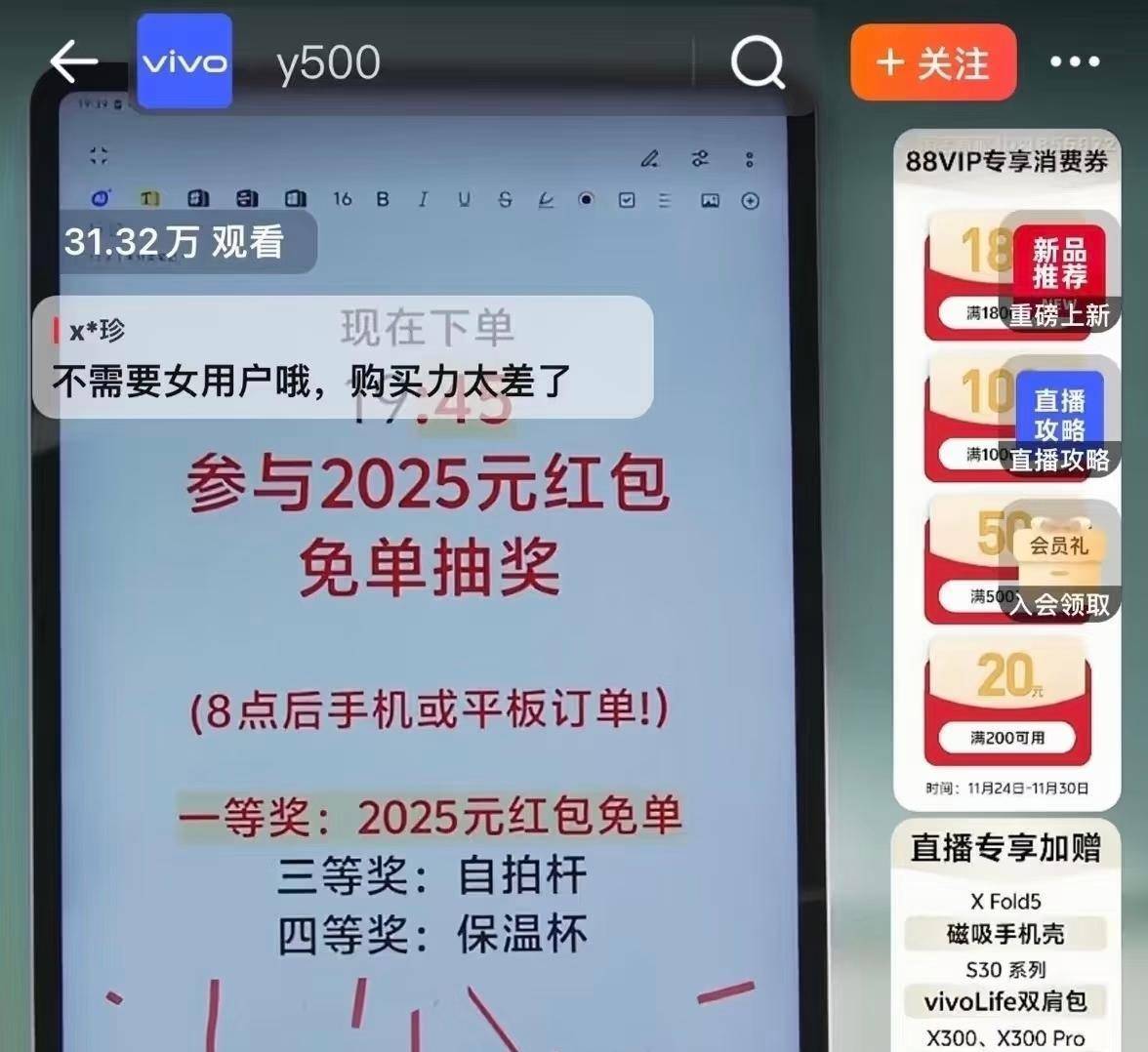 “用你们买吗集美戏真多,男人购买力够了哈”、“不需要女用户哦,购买力太差”——这两条充满争议的评论,在11月29日的vivo官方直播间被置顶,迅速引爆网络。