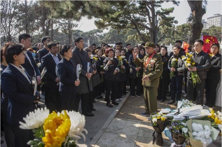 在沈阳抗美援朝烈士陵园,参加活动人员认真聆听老英雄讲述英烈们为信仰献出生命的感人故事,深刻体会“舍生取义、矢志报国”的崇高精神。